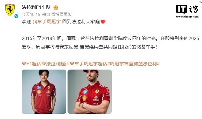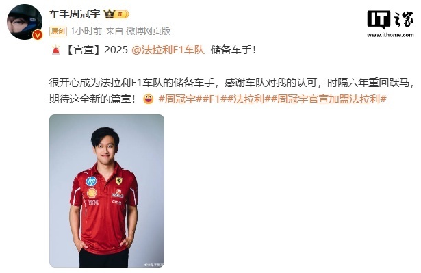IT之家 2 月 5 日音书,中国首位 F1 车手周冠宇当天官宣成为 2025 法拉利 F1 车队储备车手:“很愉快成为法拉利 F1 车队的储备车手,感谢车队对我的招供,时隔六年重回跃马,期待这全新的篇章!”